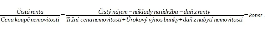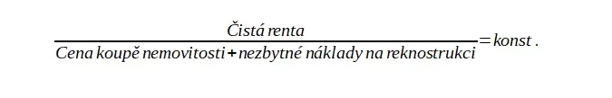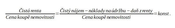 Důležité je, že je to právě tato čistá renta, která rozhodující měrou determinuje poptávku po nemovitostech, a tím i cenu koupě těchto nemovitostí. Tuto zákonitost, která je známa jako tvorba ceny výrobních faktorů při absolutně neelastické nabídce, je možné vyjádřit schématickým vzorcem: