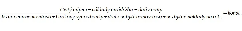 Cena koupě nemovitosti se skládá z tržní ceny nemovitosti (jistina), úrokového výnosu banky (součet všech úroků za celou dobu splácení hypotéky) a navíc ještě z daní. Její celková výše přitom je, jak již víme, determinována čistou rentou, jež tato nemovitost vynáší. Schématicky to lze vyjádřit vzorcem: