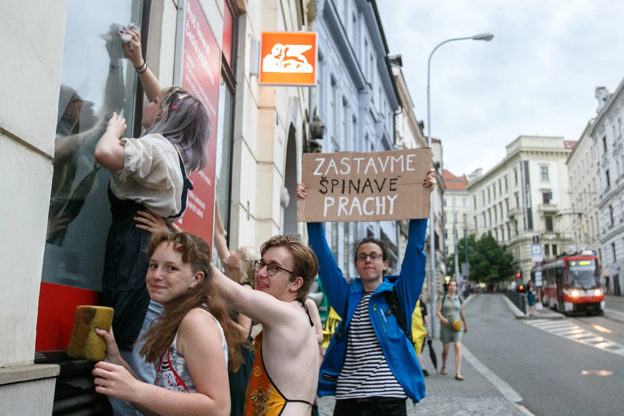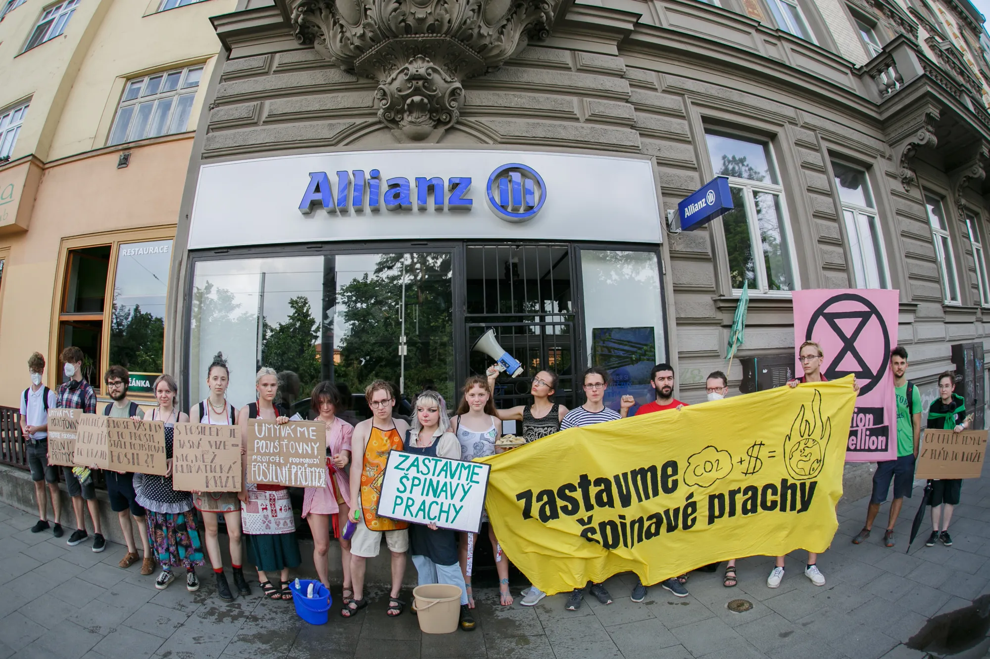 Pochod se zastavil u každé z těchto pojišťoven a účastníci symbolicky umyli výlohy budov, aby poukázali na toto „praní špinavých peněz“. Monika Búřilová, jedna z organizátorek akce, ve svém projevu připomněla, že ač může taková forma působit úsměvně, zviditelňuje závažný problém: podle vědeckých výpočtů musí Česká republika zcela přestat spalovat uhlí do roku 2030, abychom předešli klimatické katastrofě. Vyjmenované pojišťovny si však zatím hledají kličky, jak fosilní průmysl nadále podporovat, místo aby se opravdu podílely na řešení krize.