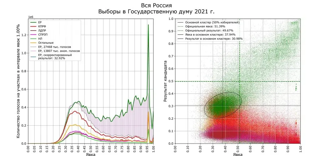 Druhý graf ukazuje výsledky stran v závislosti na volební účasti v jednotlivých okrscích. "Husté jádro" uprostřed jsou pravděpodobně nezfalšované okrsky, střed jádra pro JR, což dává odhad skutečné volební účasti a skutečného výsledku strany. Jak naznačuje Špilkin, v nefalšovaných volebních místnostech je průměrná volební účast 38 % (stejně jako v roce 2016), přičemž JR získává 31-33 % hlasů (stejně jako v roce 2011). (1) (foto 1)