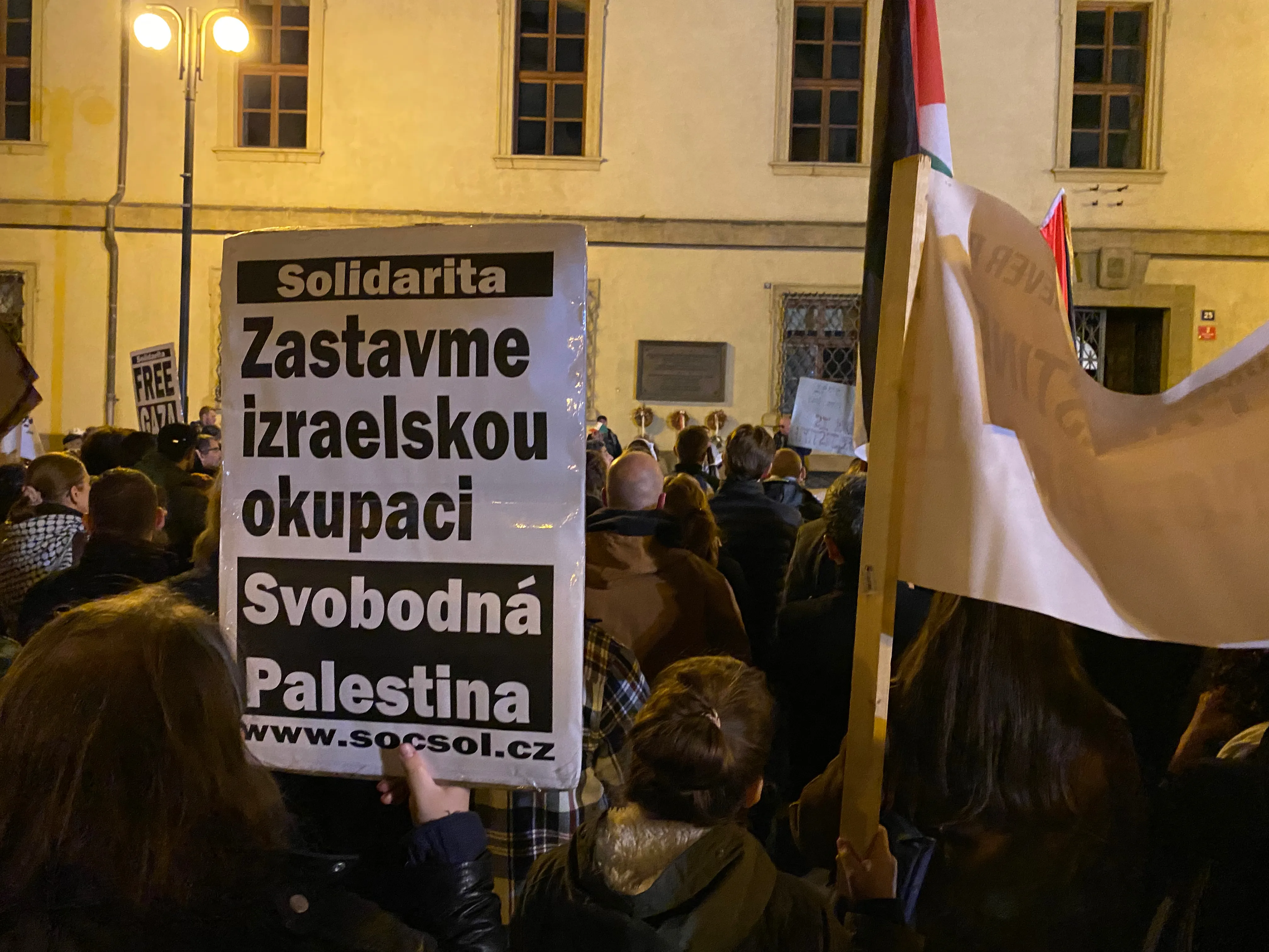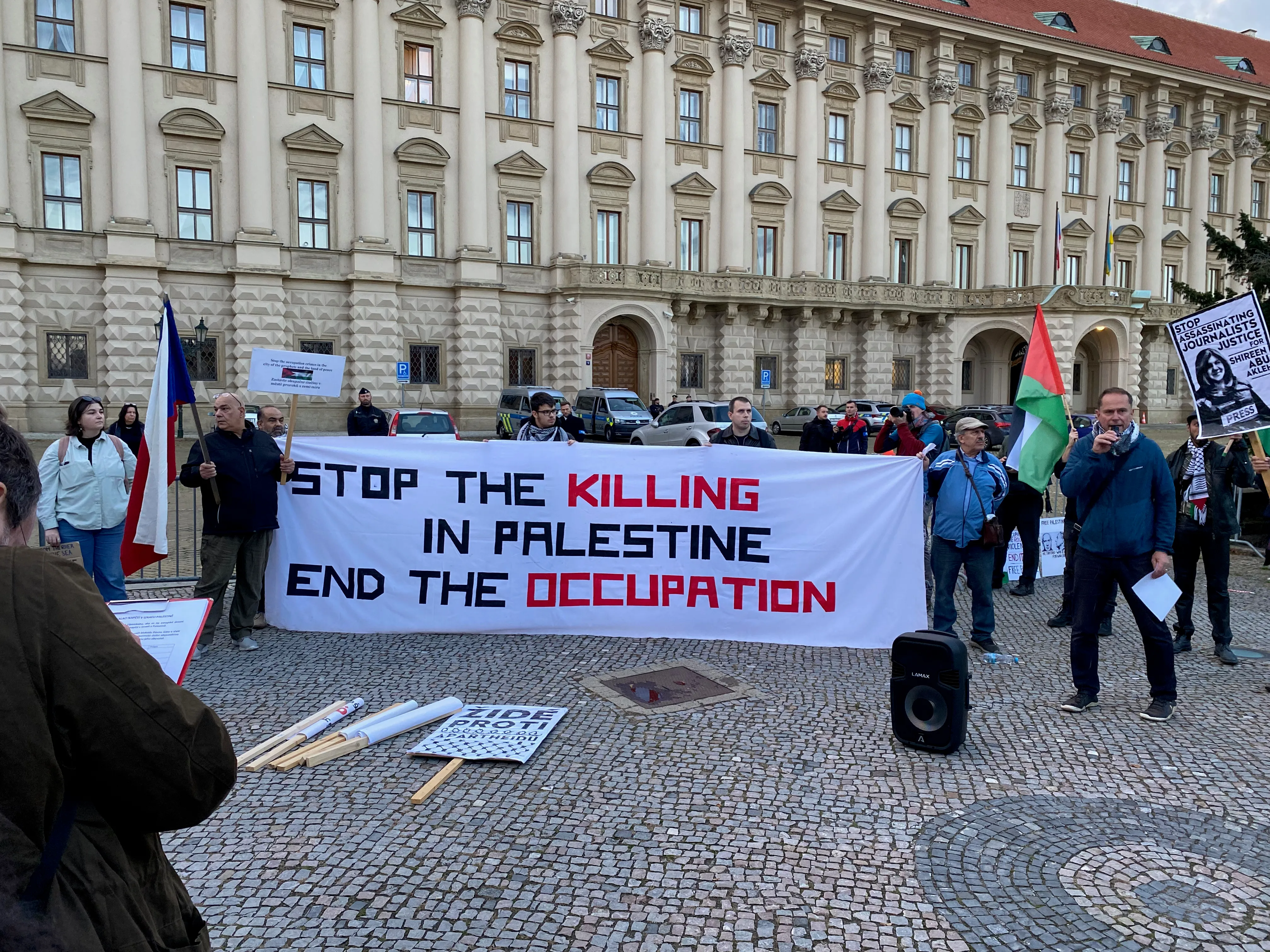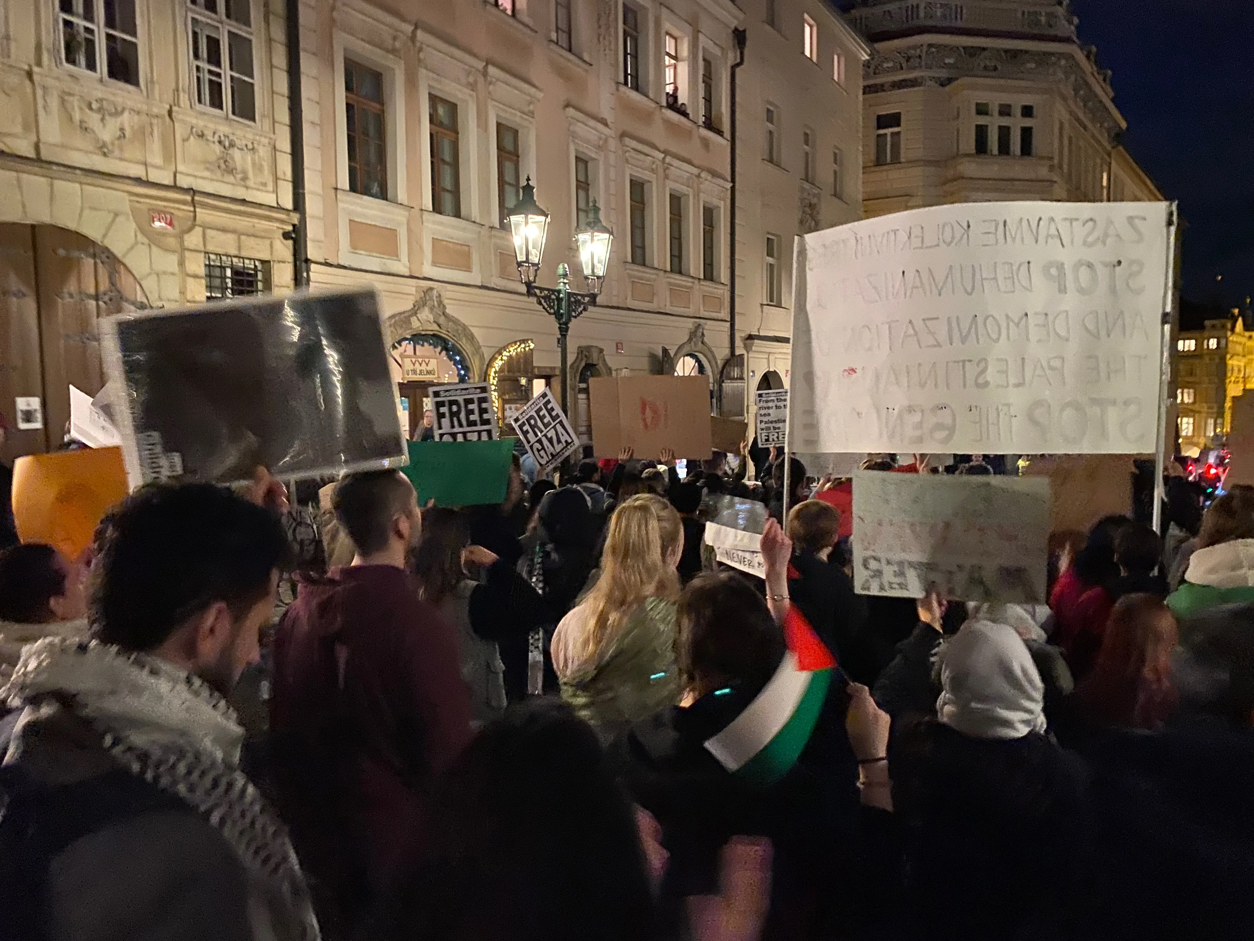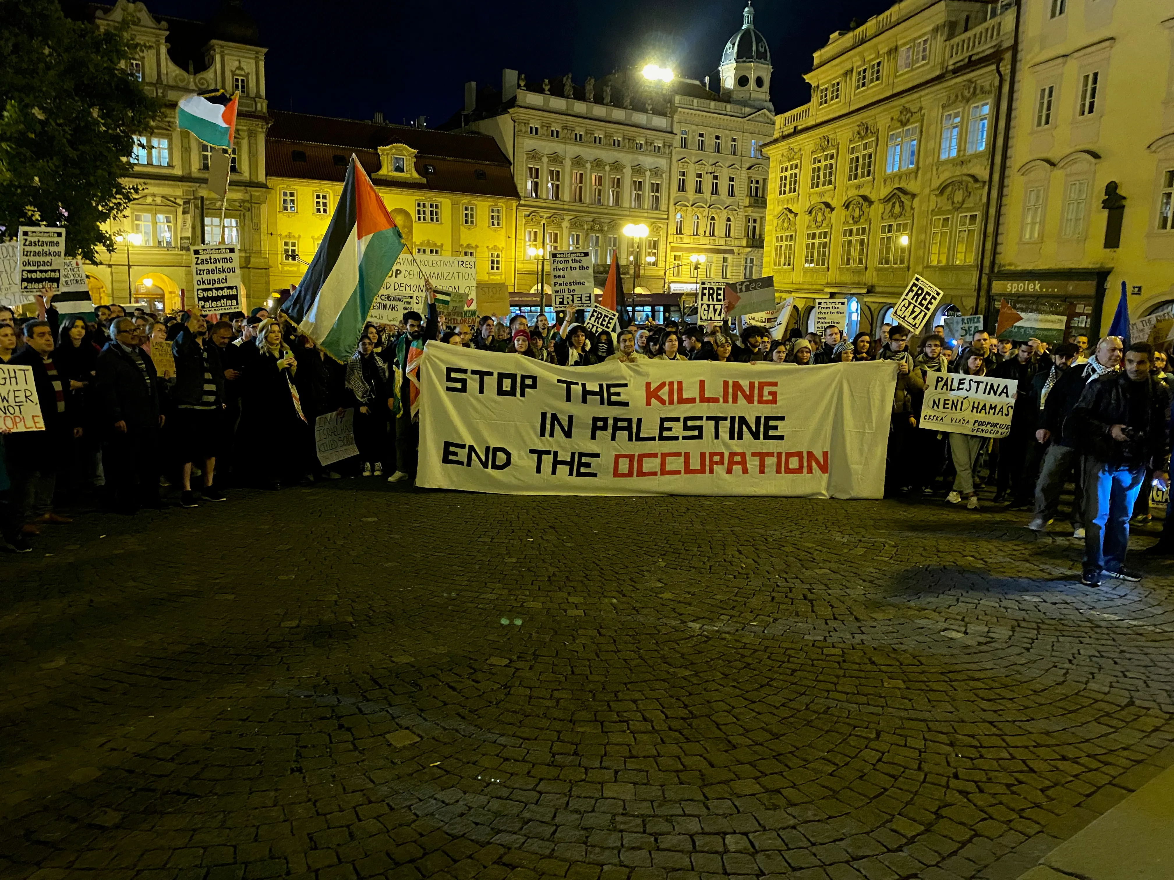 Od dlážděných uliček Loretánského náměstí až k ikonickému Pražskému hradu účastníci pozvedli své hlasy za spravedlnost, za lidská práva. Zatímco slunce zapadalo a světla města ozařovala jejich cestu zněla jejich hesla jako „Svobodná Palestina“, „Konec okupace“, „From the river to the see, all the people will be free“ (Od řeky až k moři, budou všichni svobodní) atd. Na každé zastávce zaznívaly vášnivé projevy, které posilovaly poselství tohoto setkání.