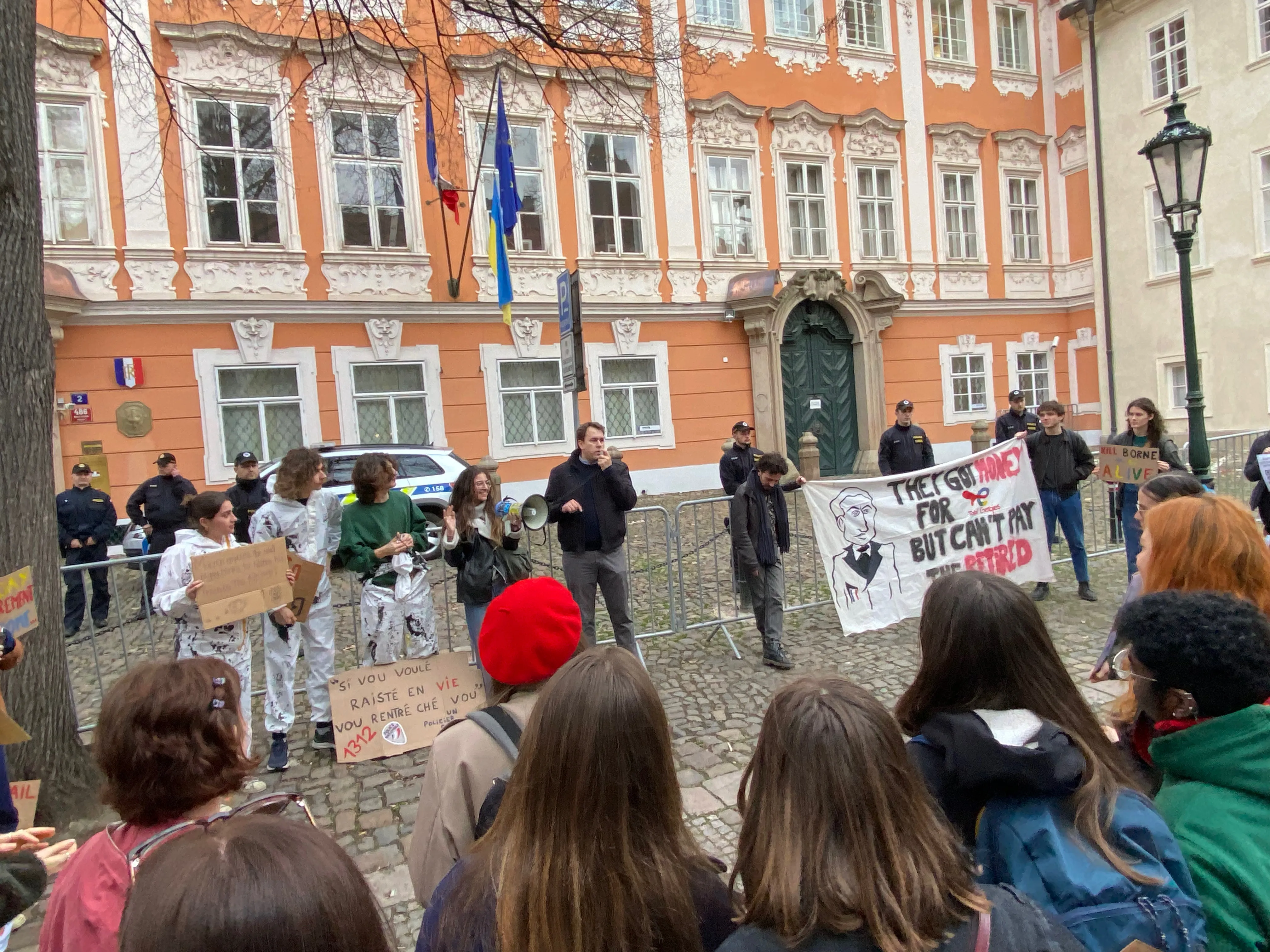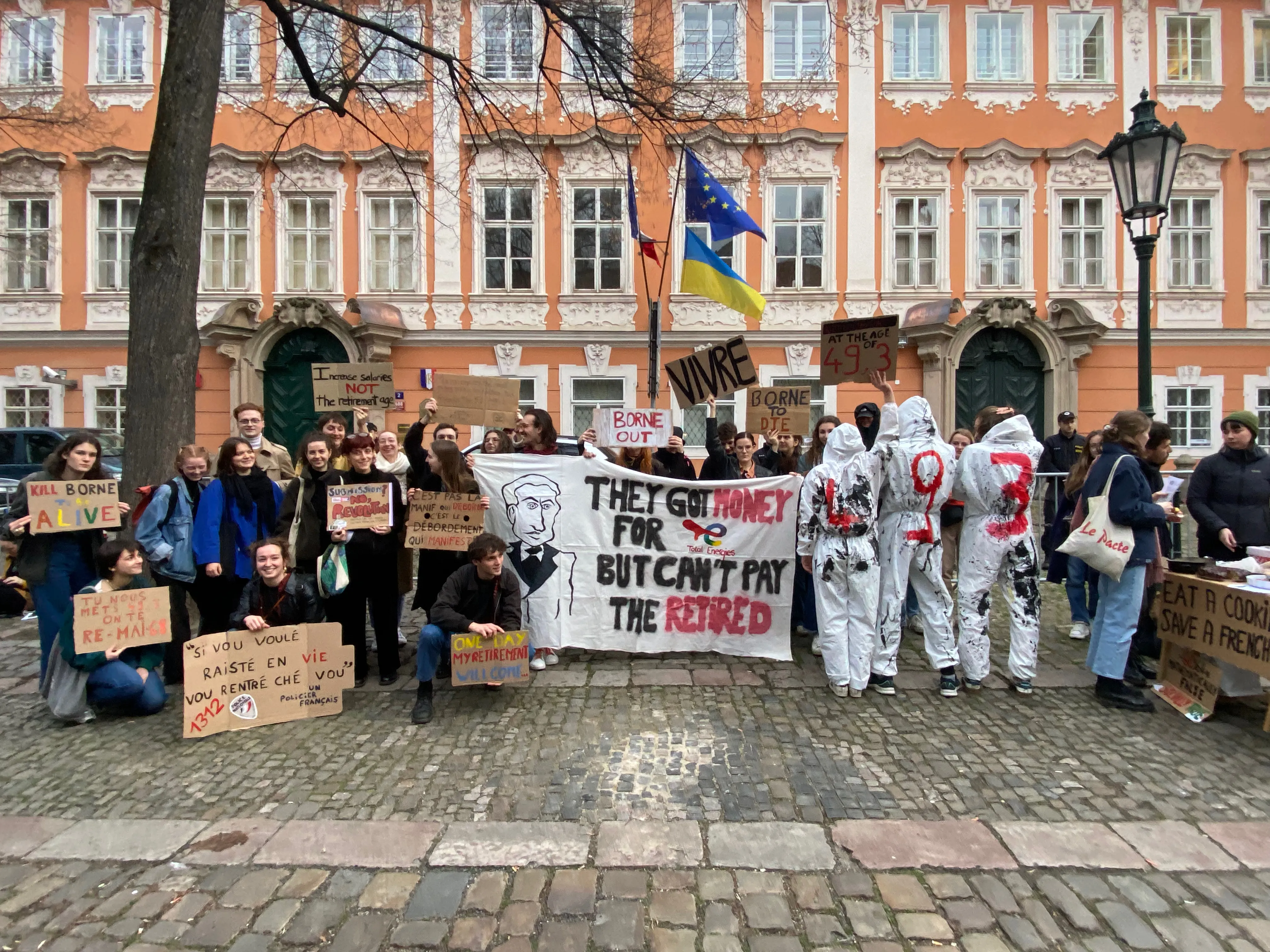 Ve čtvrtek 23. března se zhruba 60 lidí sešlo na protestním shromáždění před francouzskou ambasádou v Praze. Účastníci protest chtěli vyjádřit svůj nesouhlas s politikou prezidenta Macrona. Ten se rozhodl i přes odpor většiny Francouzů prosadit důchodovou reformu a to navíc skrze ústavní kličku. Vyhnul se tak přímému hlasování o reformě. Protest svolali francouzští studenti, kteří v Praze studují a žijí.